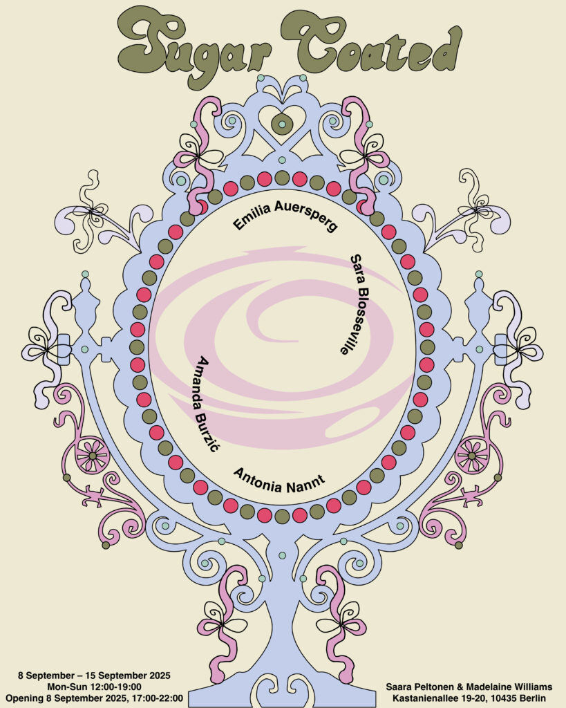 Sugar Coated presents the work of four artists – Emilia Auersperg, Sara Blosseville, Amanda Burzić, and Antonia Nannt – together in a space that is not yet fully complete: an under-construction hair-beauty-make-up salon with a gallery upstairs. Situated on Kastanienallee, between a mix of boutiques, cosmetic studios, and barber shops, the exhibition looks at our attraction to material things, the ways we adorn ourselves, and often externalized processes of transformation. Through the patterned glass window upstairs, visitors will glimpse a sparkling, candy-coloured display.